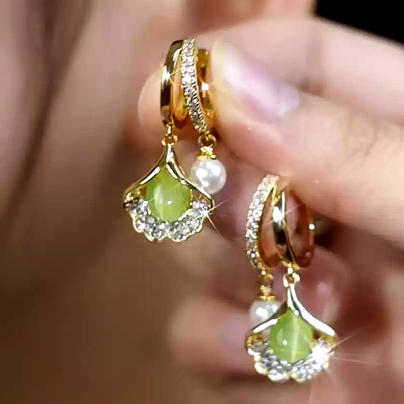 14K Gold-Plated Green Crystal Ginkgo Leaf Earrings