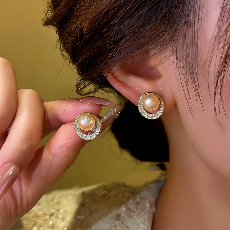 14K Gold-Plated Hollow Diamond Pearl Stud Earrings