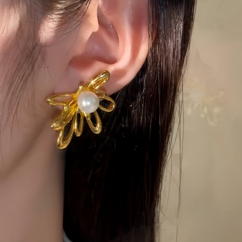 14K Gold-Plated Hollow Metal Flower Pearl Earrings