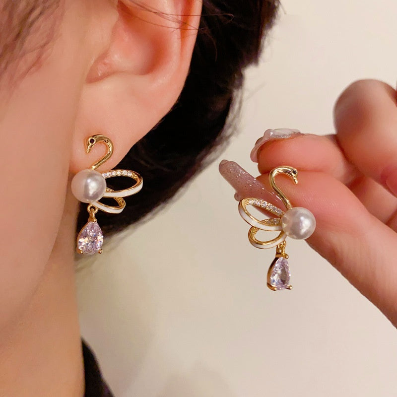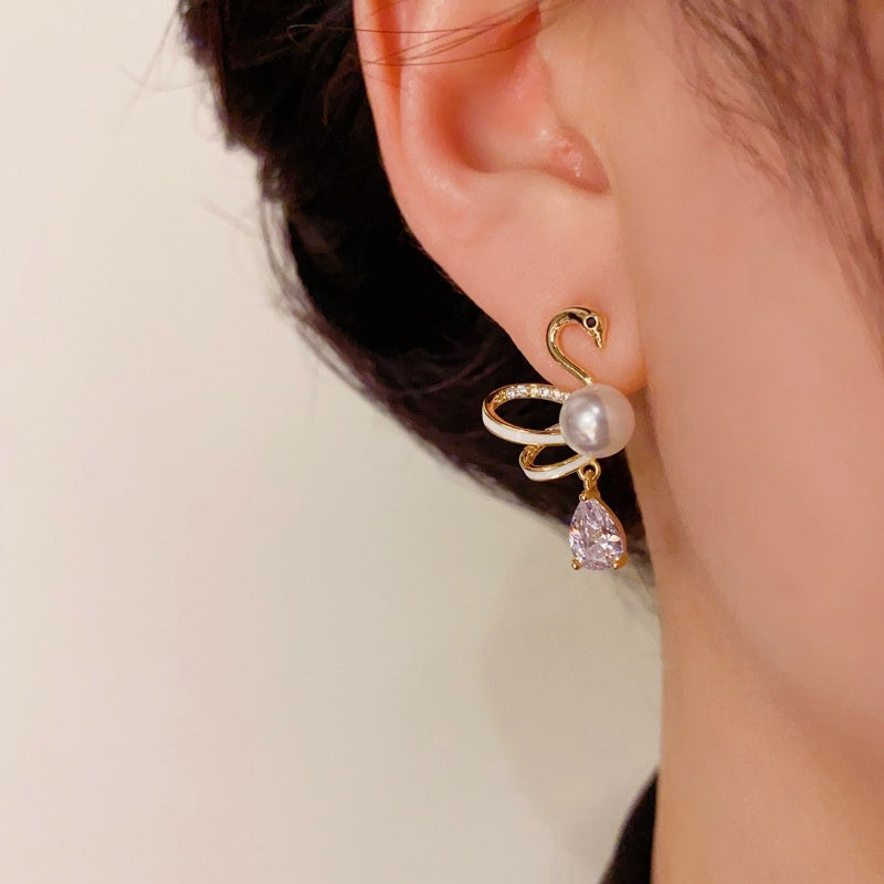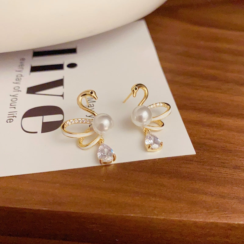 14K Gold-Plated Hollow Zircon Pearl Swan Earrings