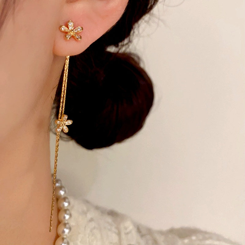 14K Gold-Plated Long Diamond Flower Tassel Earrings