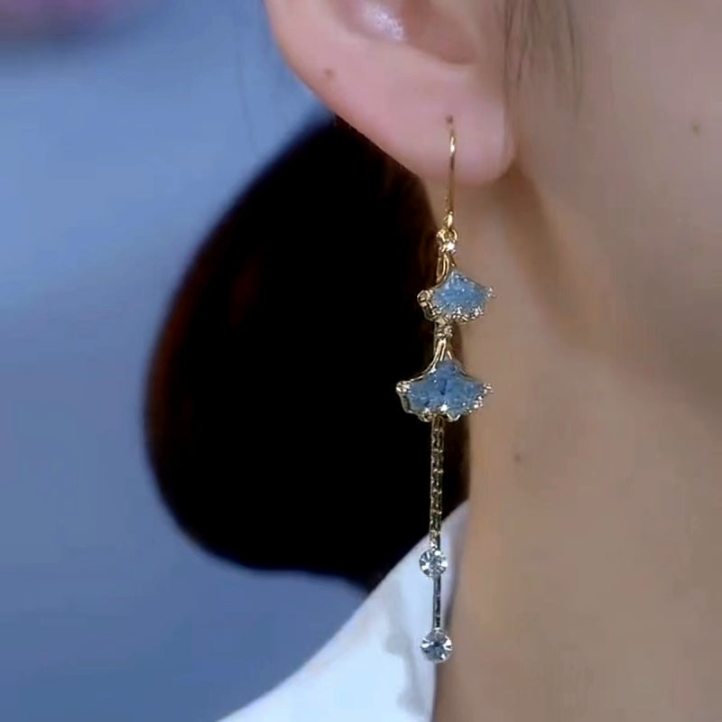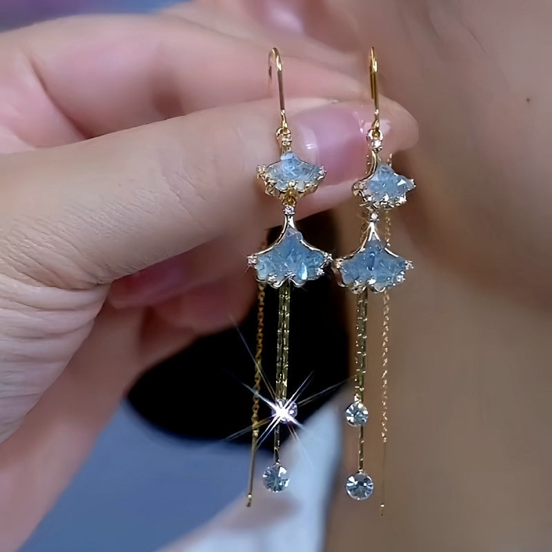 14K Gold-Plated Luxury Blue Crystal Leaf Threader Earrings
