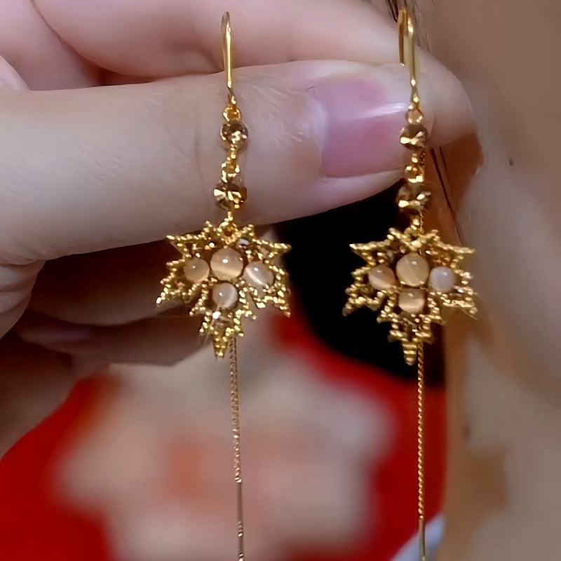 14K Gold-Plated Luxury Brown Diamond Maple Leaf Tassel Threader Earrings