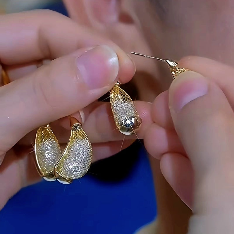 14K Gold-Plated Luxury Diamond-Encrusted Gold Mesh Earrings