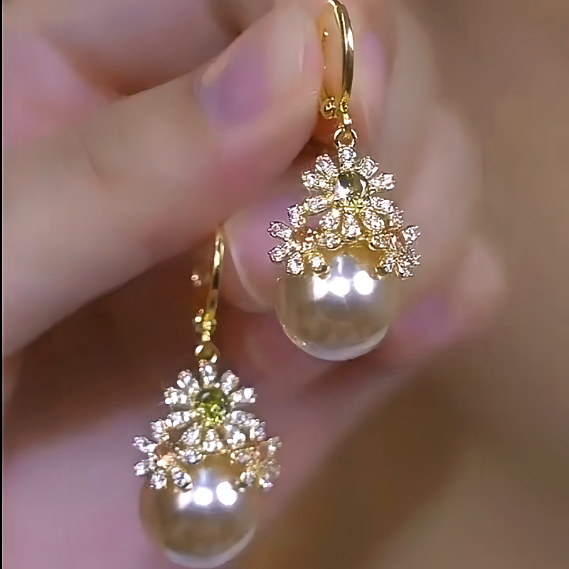 14K Gold-Plated Luxury Diamond Flower Pearl Earrings