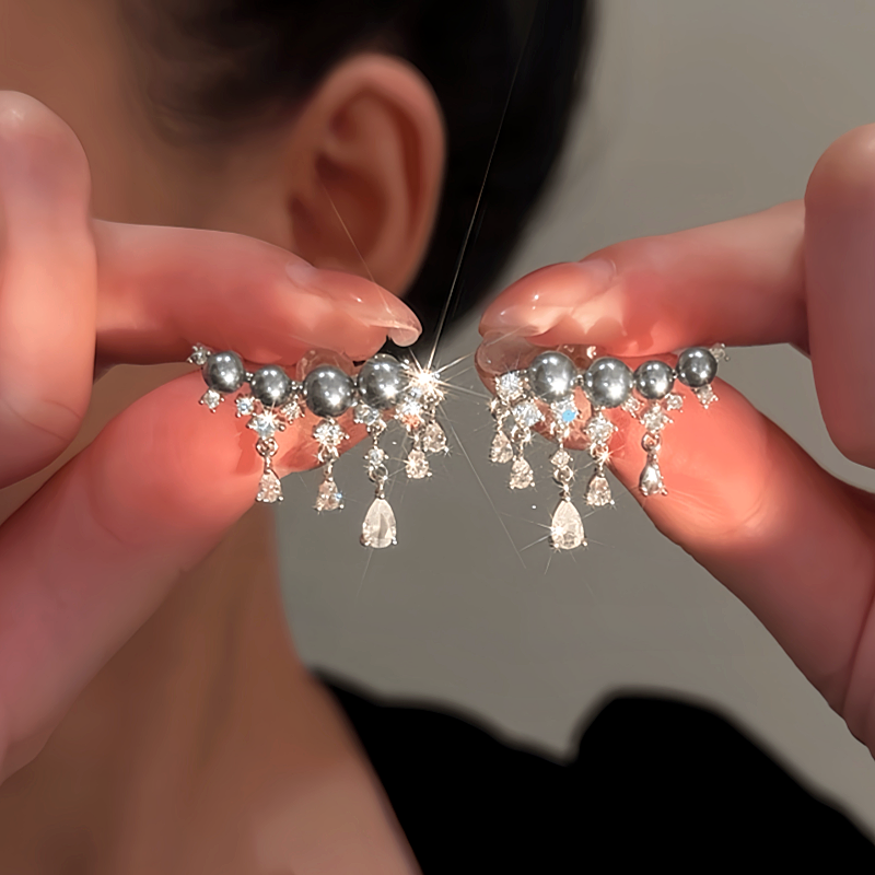 14K Gold-plated Luxury Diamond Gray Pearl Tassel Earrings