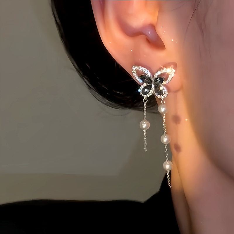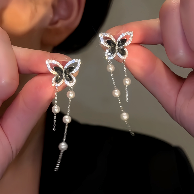14K Gold-Plated Luxury Zircon Black Diamond Butterfly Pearl Tassel Earrings