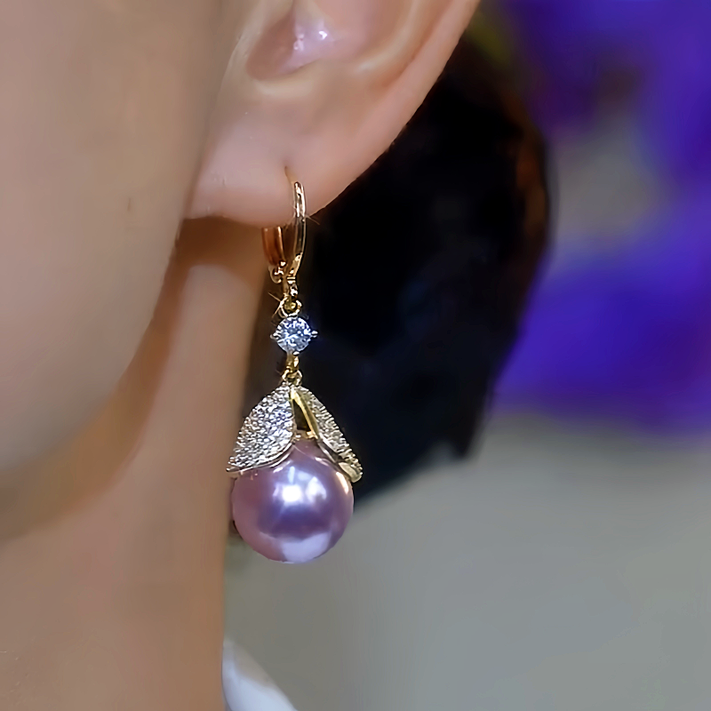 14K Gold-Plated Luxury Zircon Inlaid Pearl Leaf Earrings