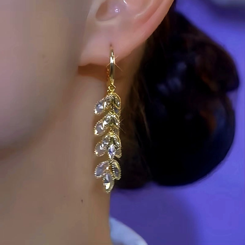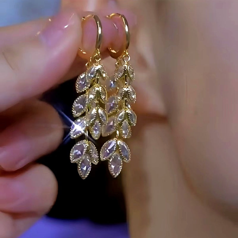 14K Gold-Plated Luxury Zircon Leaf Tassel Earrings