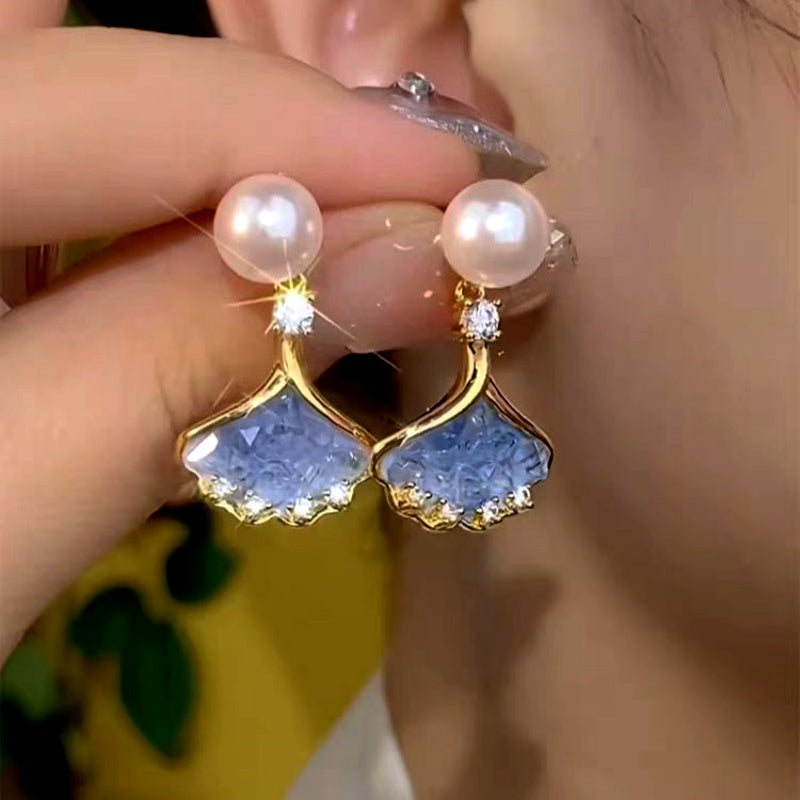 14K Gold-Plated Luxury Zircon Pearl Blue Crystal Leaf Earrings