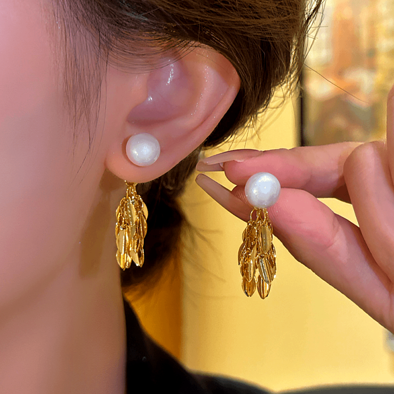 14K Gold-plated Pearl Leaf Tassel Earrings
