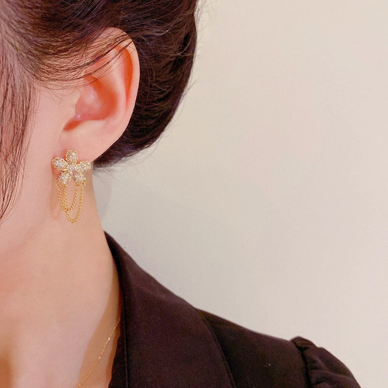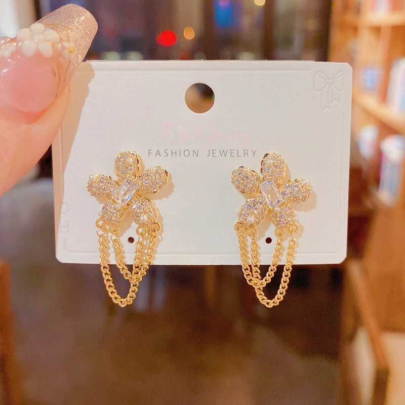 14K Gold-plated Pearl Zircon Flower Chain Earrings
