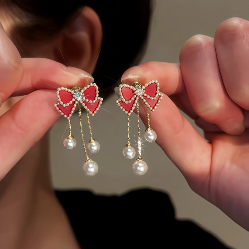 14K Gold Plated Red Bow Pearl Tassel Earrings