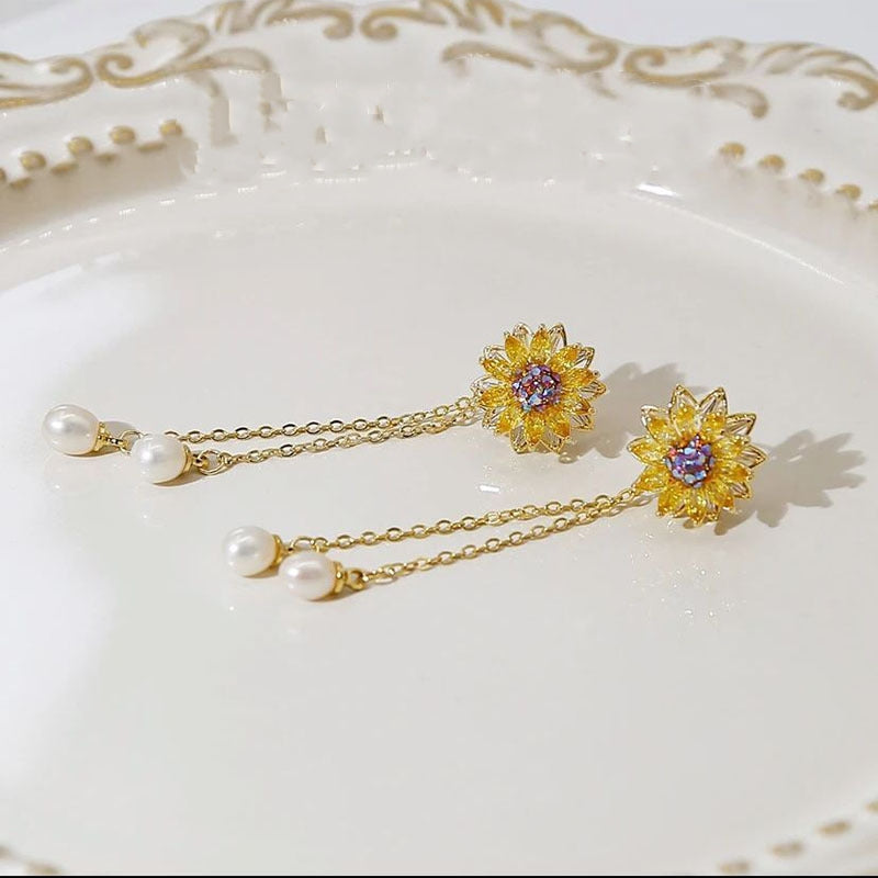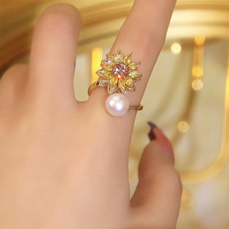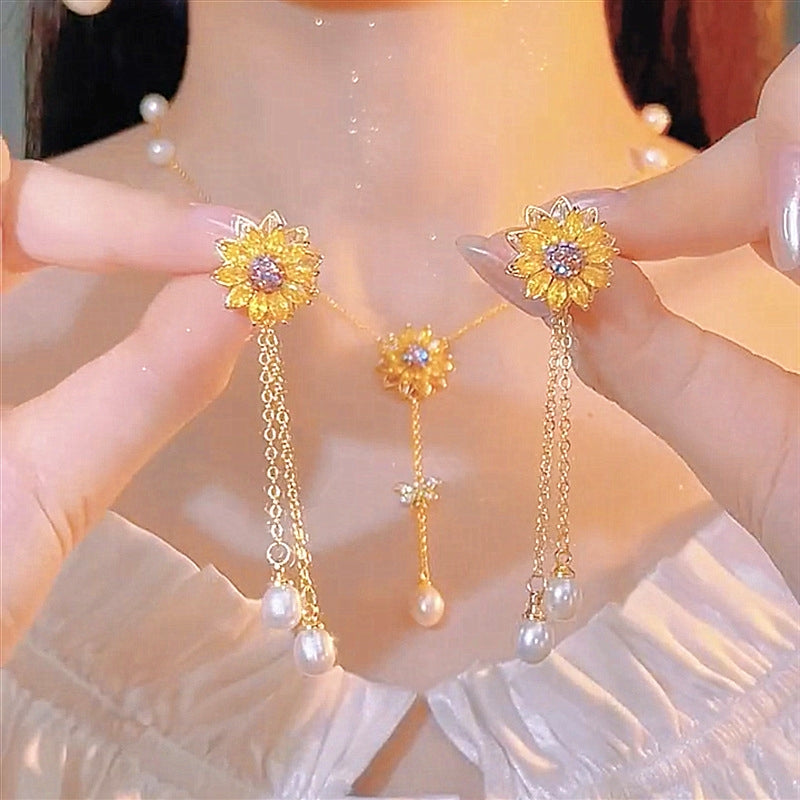 14K Gold Plated Rotating Daisy Sunflower Pearl Earrings Necklace And Ring Sets