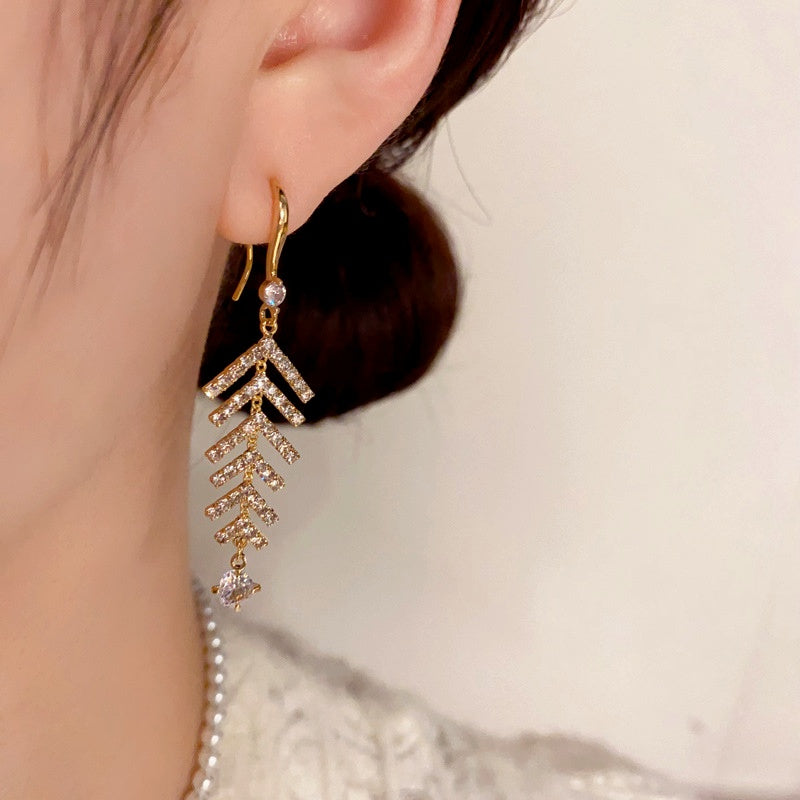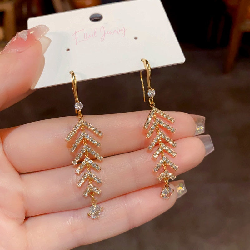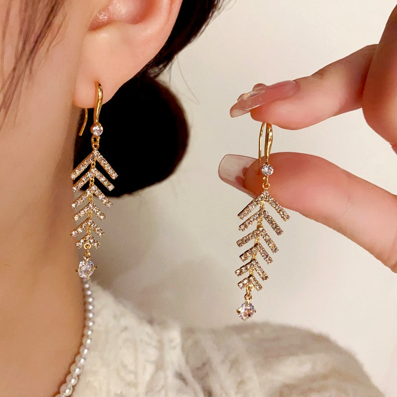 14k Gold-Plated Simple And Unique Zircon Leaf Tassel Ear Hooks