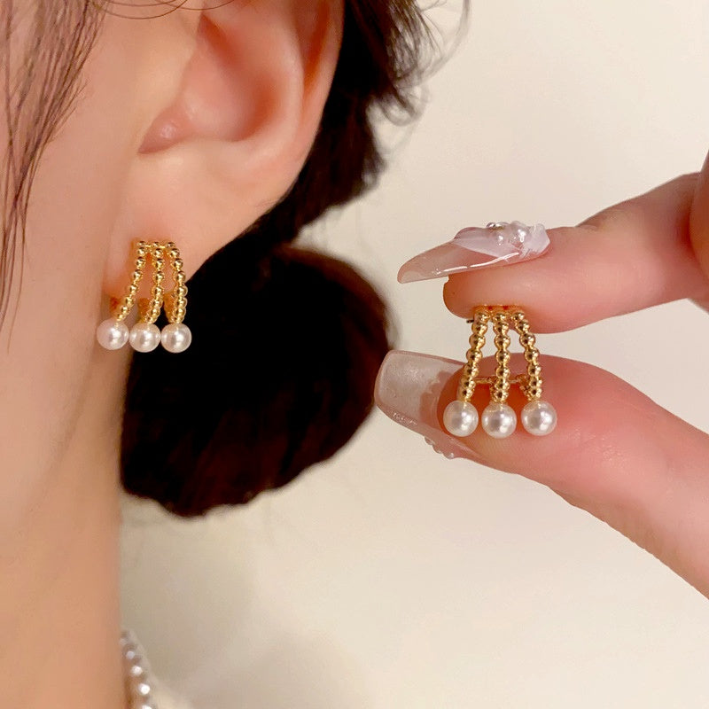 14K Gold-Plated Three-Row Hollow Pearl Earrings