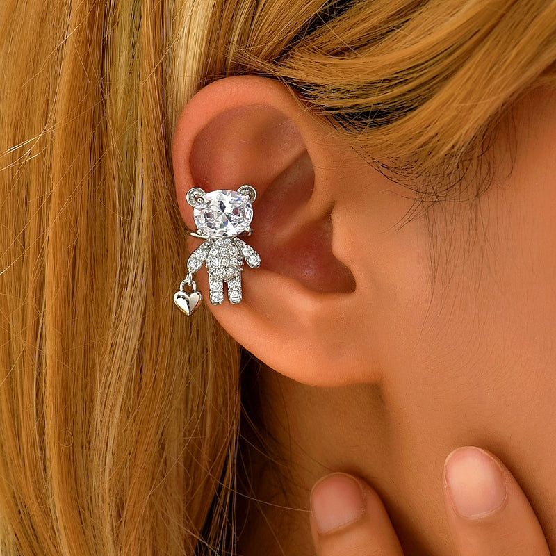 14K Gold-plated Zircon Bear Heart Ear Clips (1 Piece)