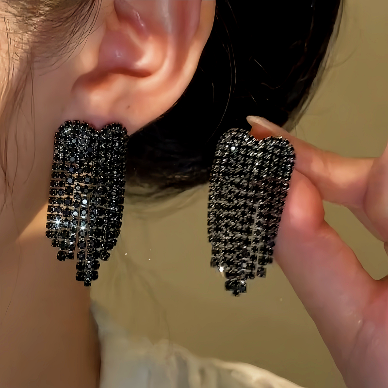 14K Gold-Plated Zircon Black Diamond Heart Tassel Earrings