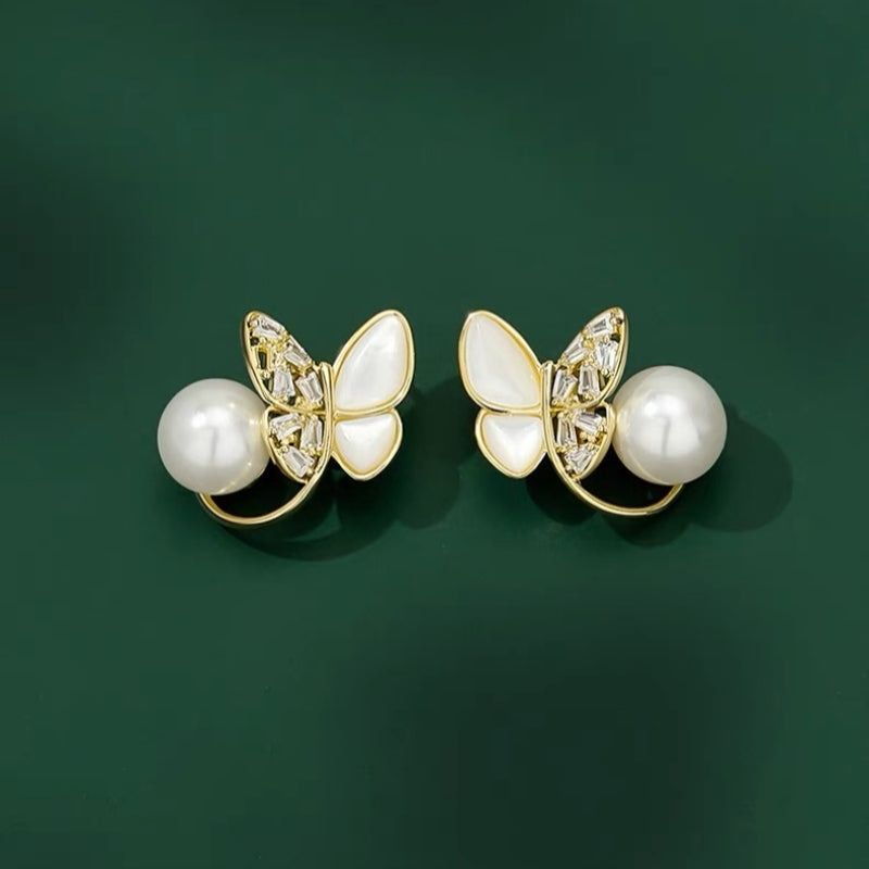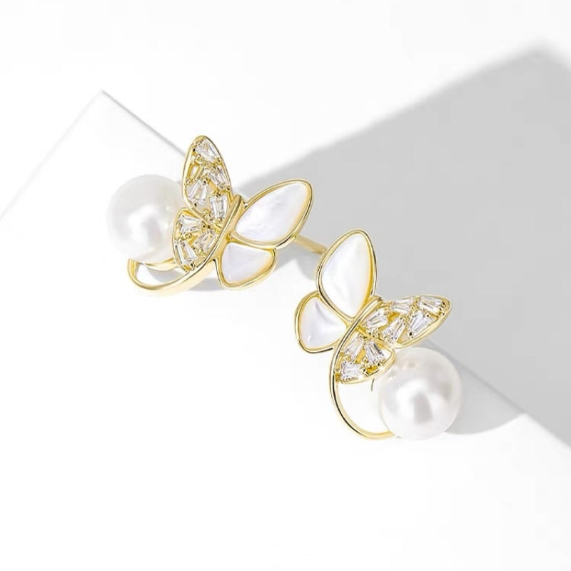 14K Gold-Plated Zircon Butterfly Pearl Studs