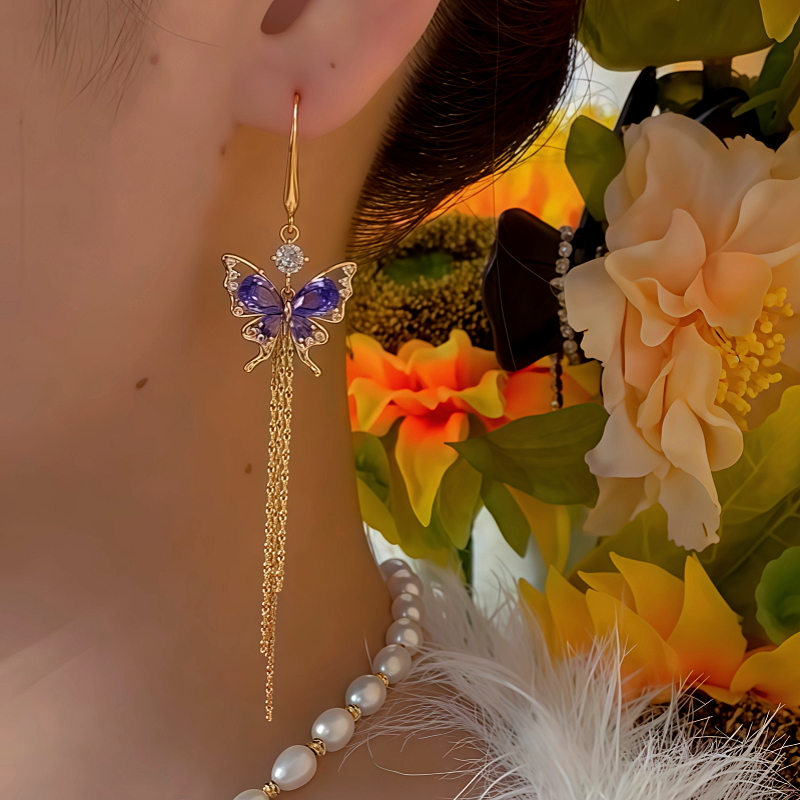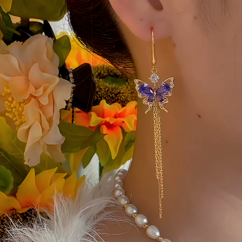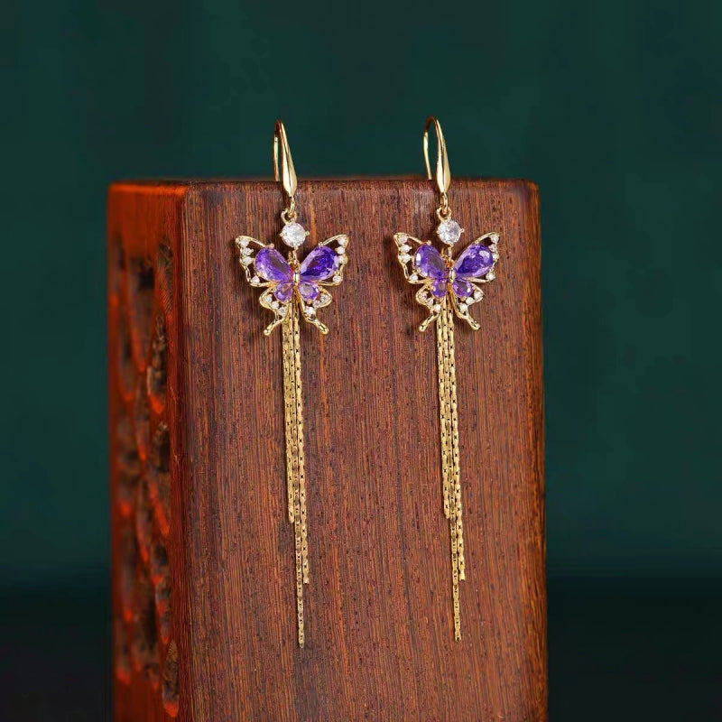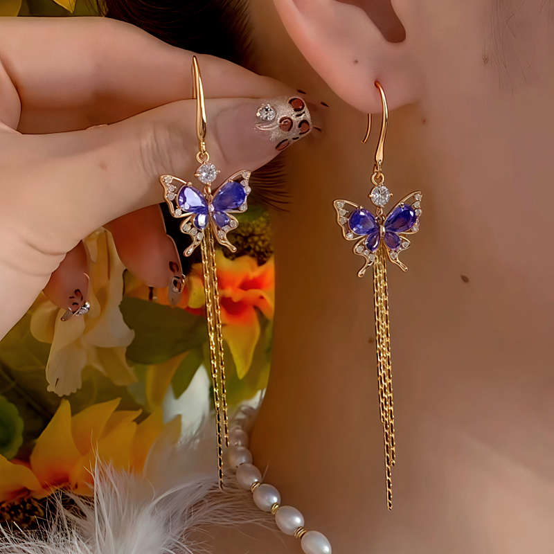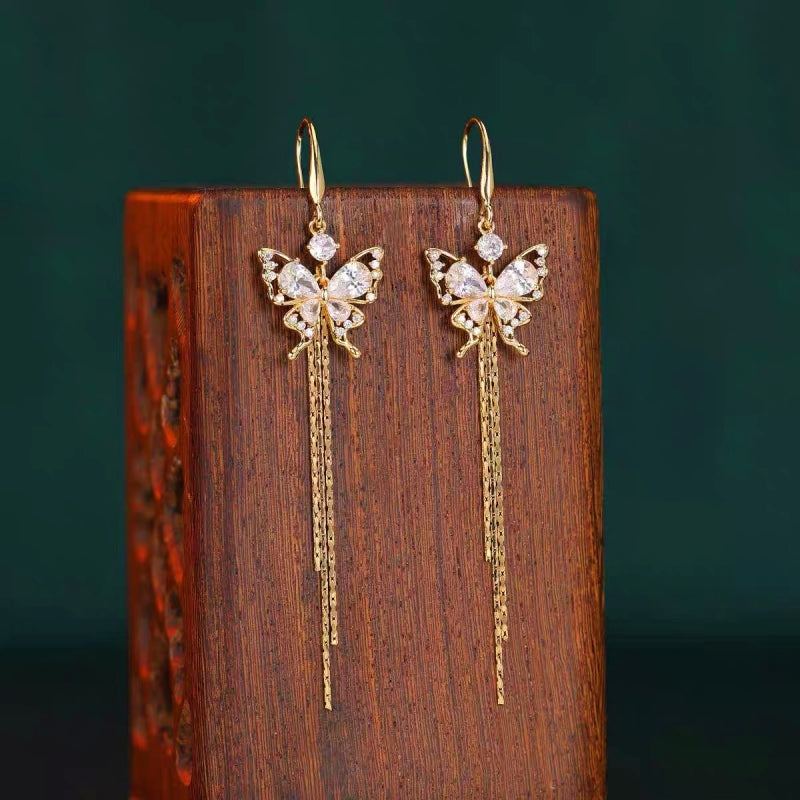 14K Gold-Plated Zircon Butterfly Tassel Earrings