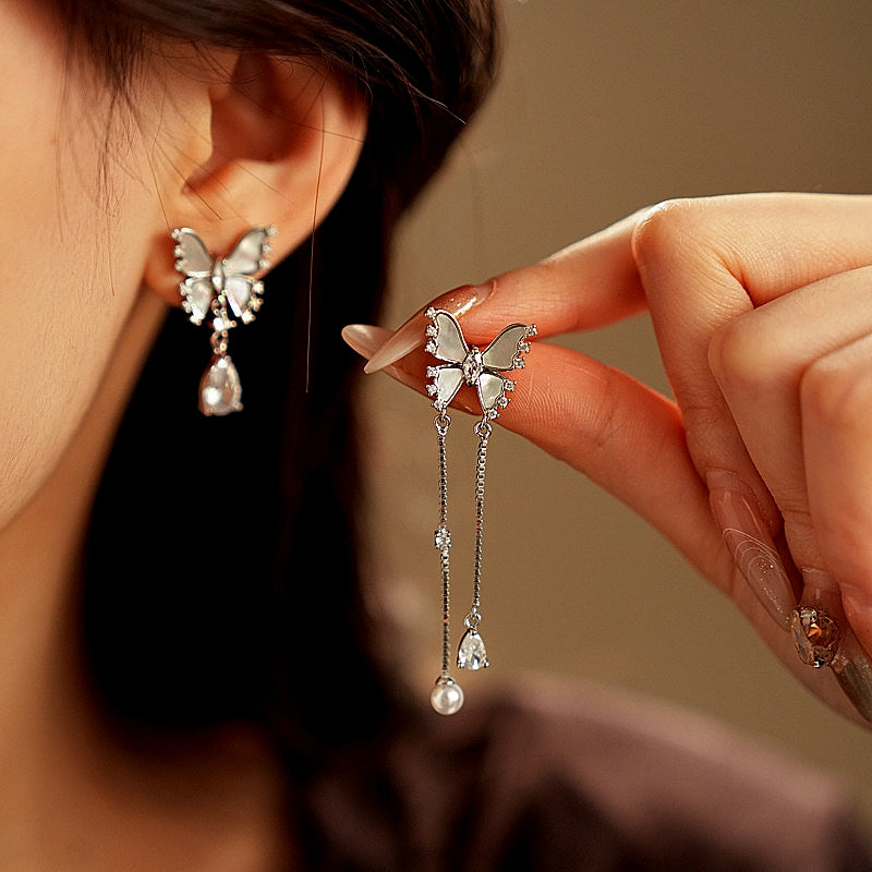 14K Gold-Plated Zircon Butterfly Tassel Earrings