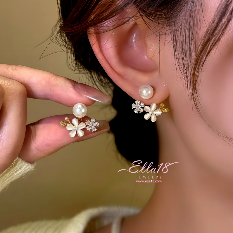 14K Gold-Plated Zircon Cat's Eye Stone Flower Pearl Earrings