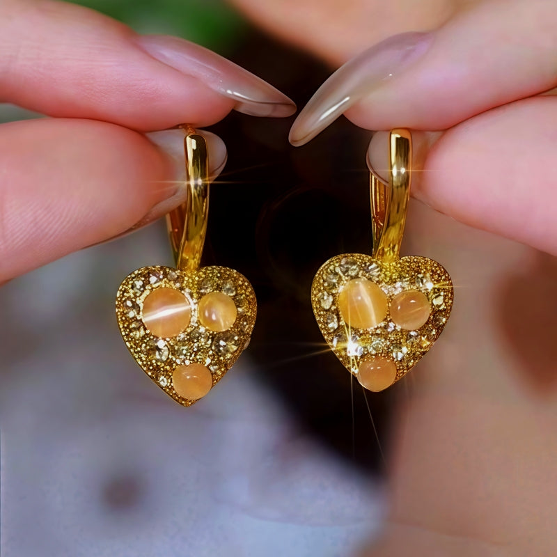 14K Gold-Plated Zircon Cat's Eye Stone Heart Earrings