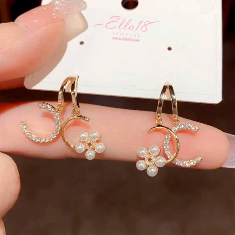 14K Gold-Plated Zircon Diamond Double-C Flower Pearl Earrings