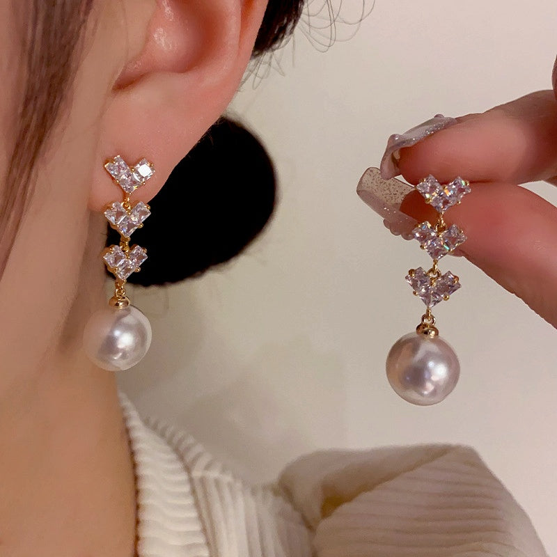 14K Gold-Plated Zircon Diamond Heart Pearl Tassel Earrings