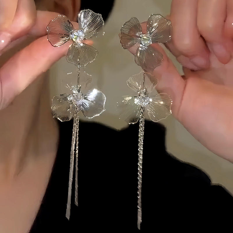 14K Gold-Plated Zircon Double Flower Tassel Earrings