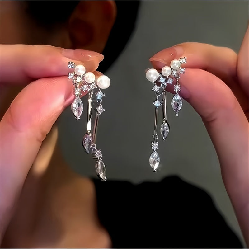 14K Gold-Plated Zircon Drop Pearl Tassel Earrings