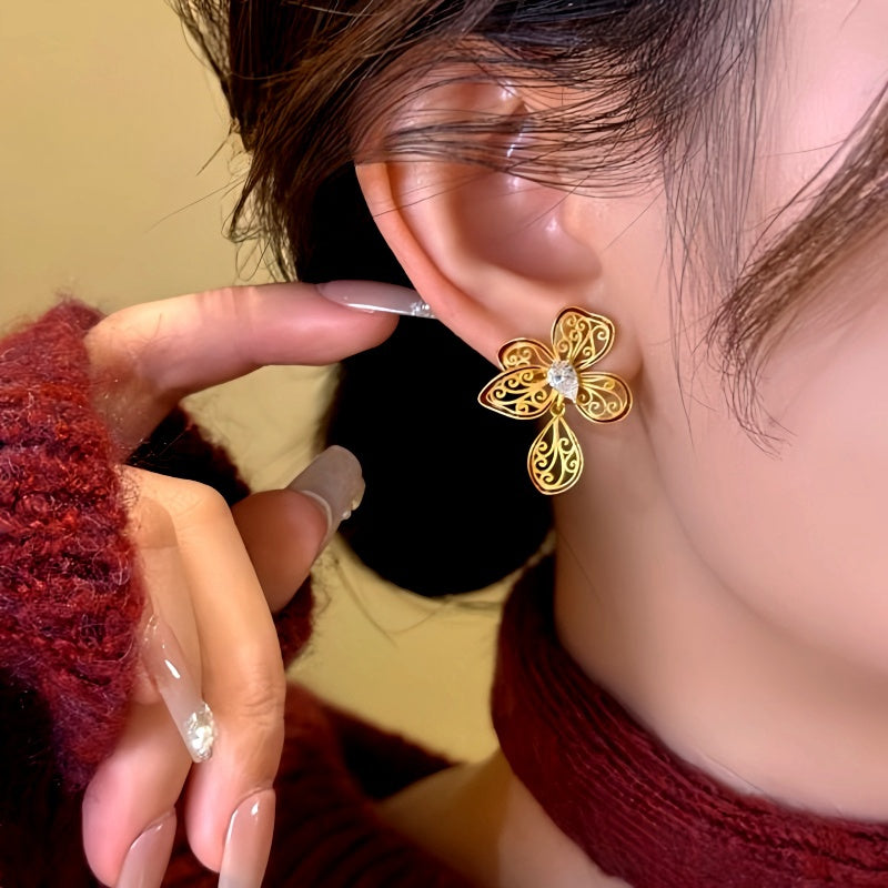 14K Gold-Plated Zircon Enamel Filigree Flower Earrings