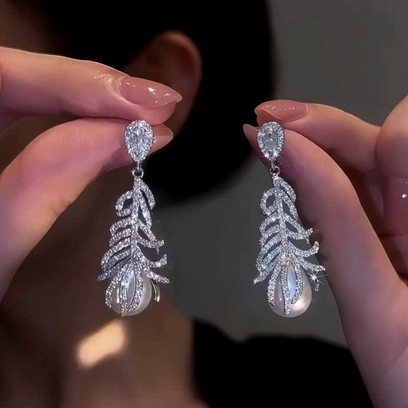 14K Gold-Plated Zircon Feather Pearl Earrings