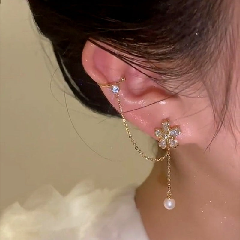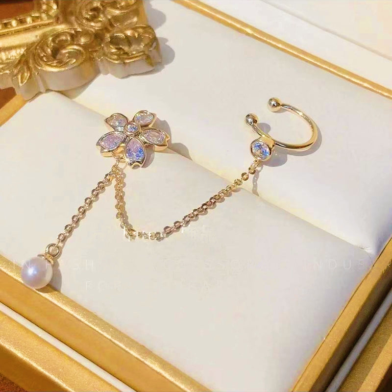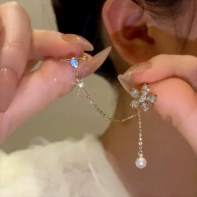14K Gold-Plated Zircon Flower Chain Ear Clip Earrings ( 1 Pair )