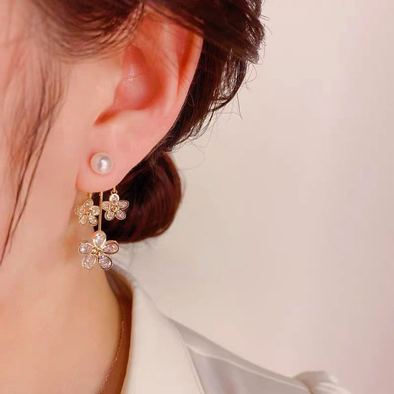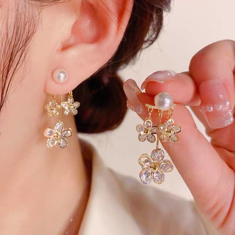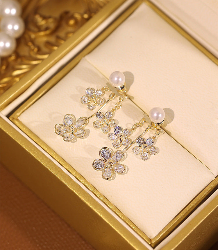 14K Gold-plated Zircon Flower Pearl Earrings