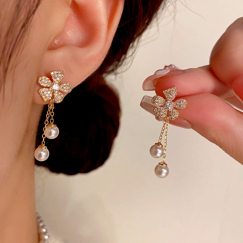 14K Gold-Plated Zircon Flower Pearl Tassel Earrings