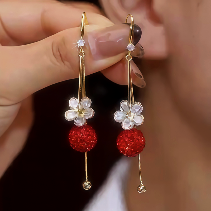 14K Gold-Plated Zircon Flower Red Crystal Ball Ear Hook Earrings