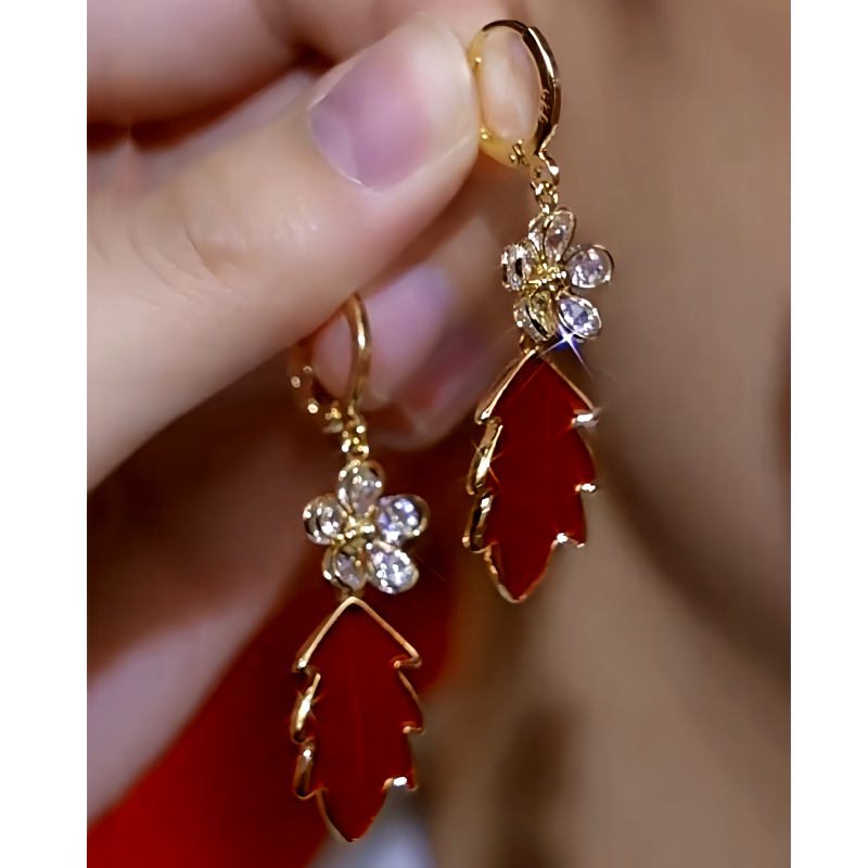 14K Gold-Plated Zircon Flower Red Leaf Earrings