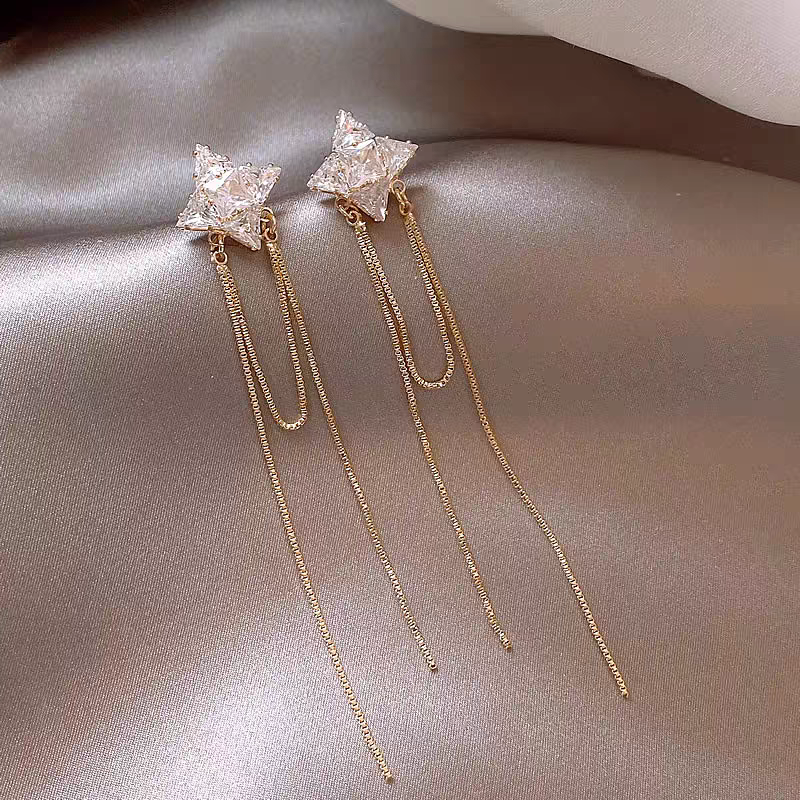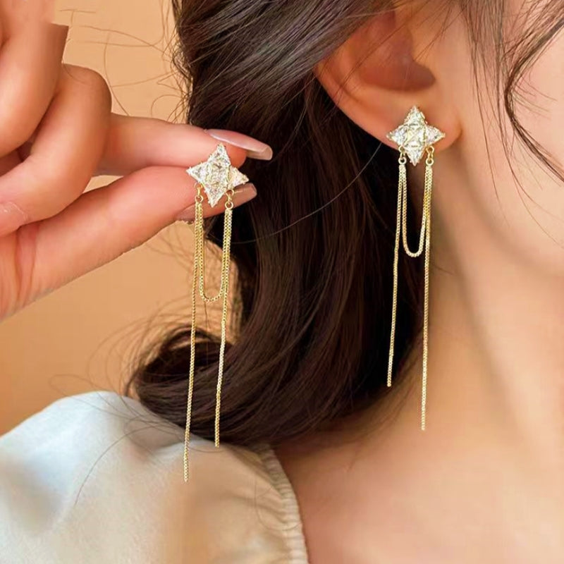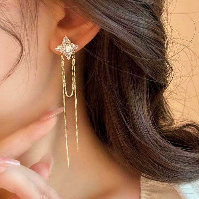 14k Gold-Plated Zircon Four-Pointed Star Long Tassel Earrings