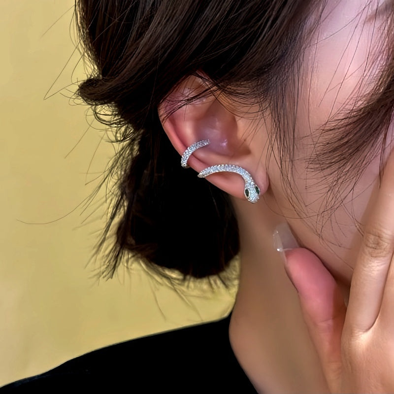 14K Gold-Plated Zircon Green-Eyed Snake Ear Clip Earrings