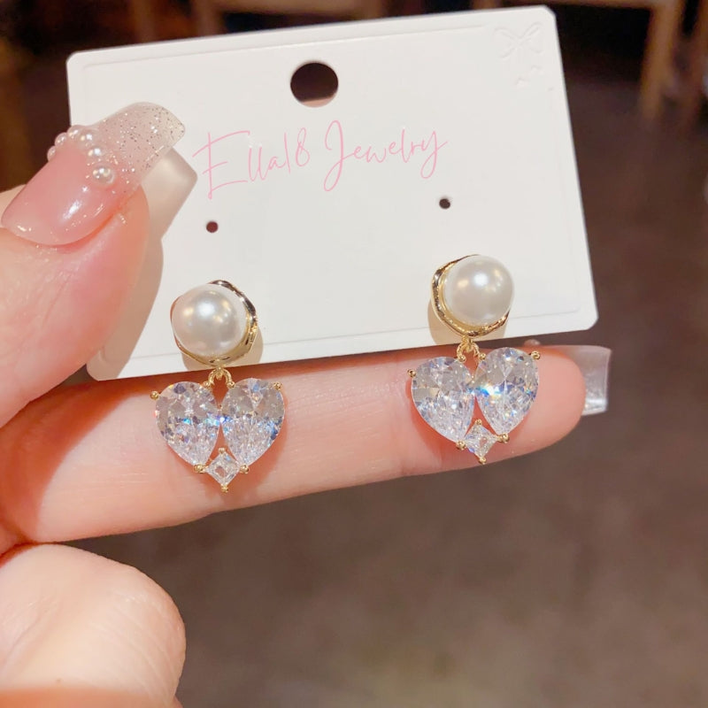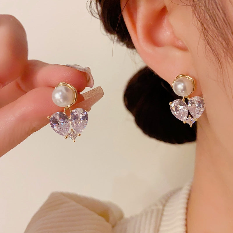 14K Gold-Plated Zircon Heart Pearl Earrings