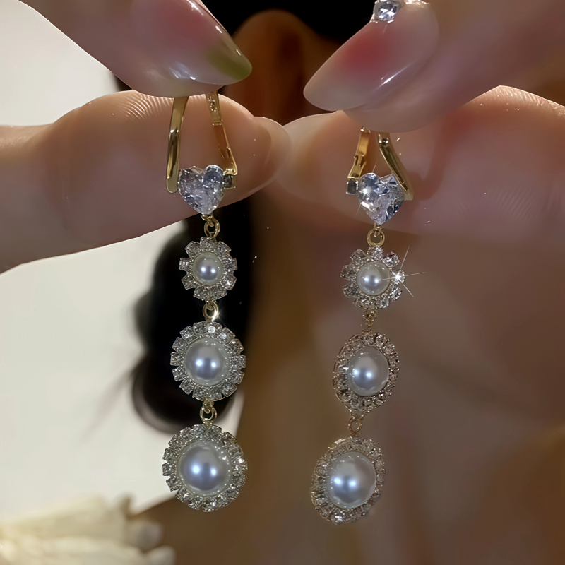 14K Gold-Plated Zircon Heart Pearl Tassel Earrings
