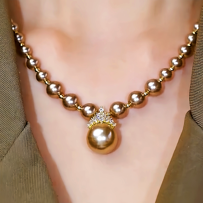 14K Gold-Plated Zircon Inlaid Champagne Pearl Necklace