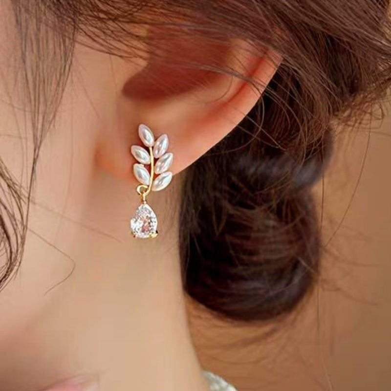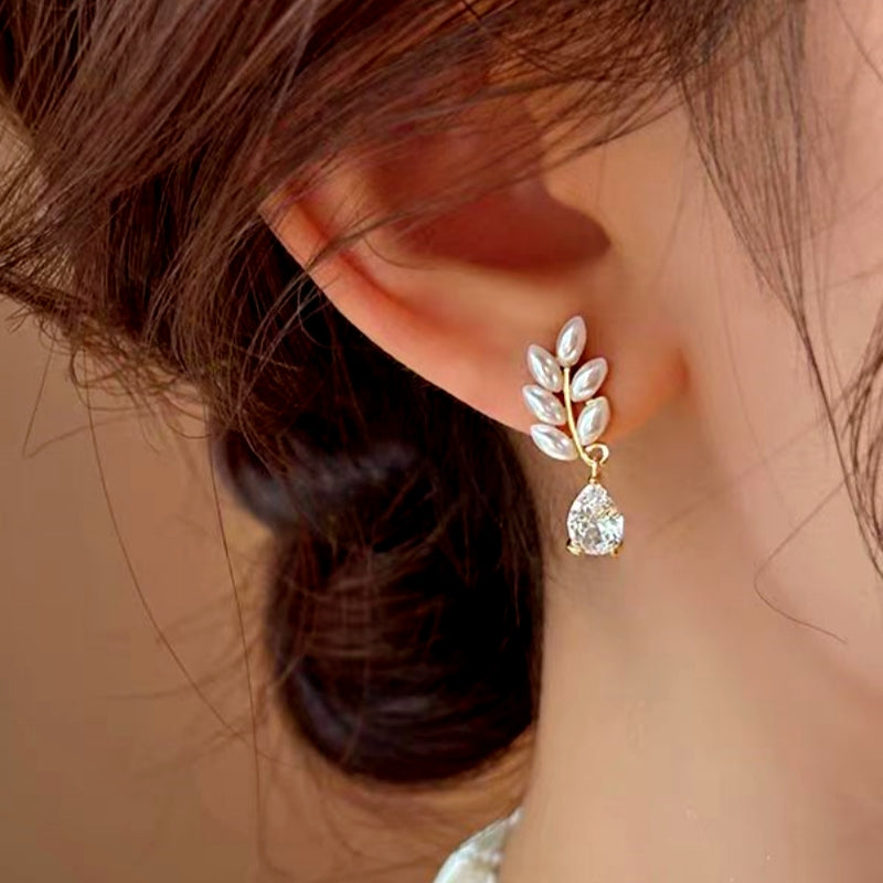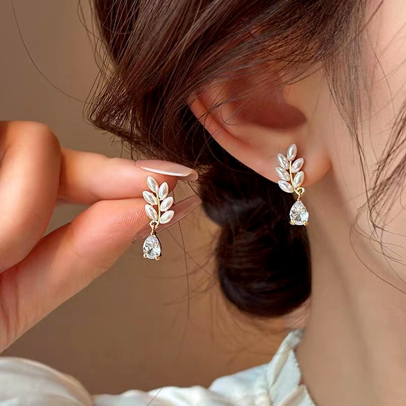 14K Gold-Plated Zircon Leaf Flower Earrings