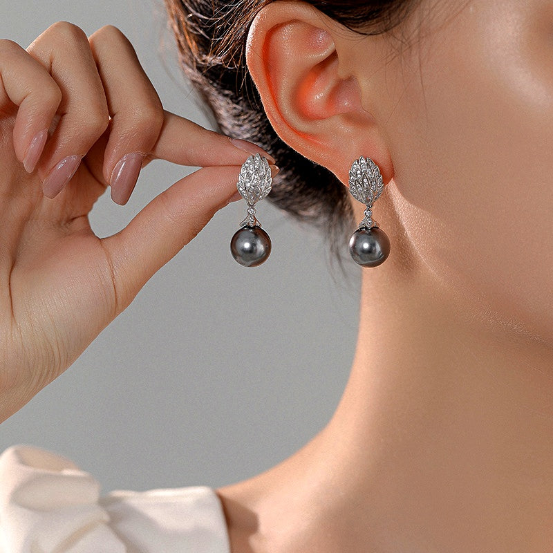 14K Gold-Plated Zircon Leaf Gray Pearl Earrings