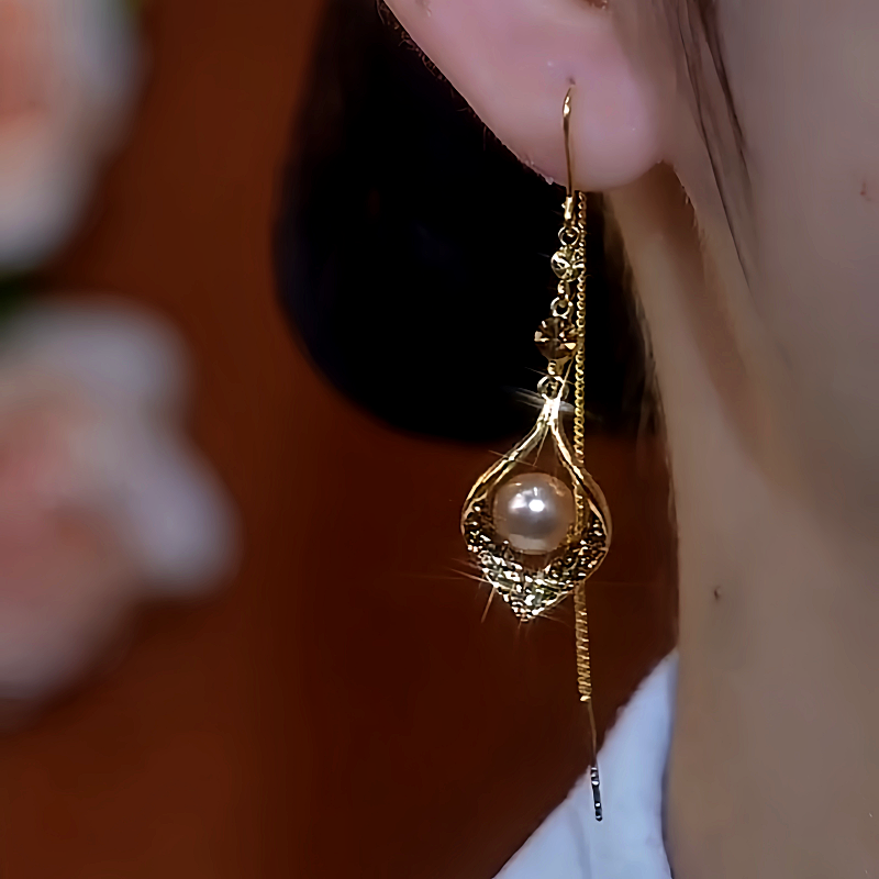 14K Gold-Plated Zircon Leaf Pearl Threader Earrings