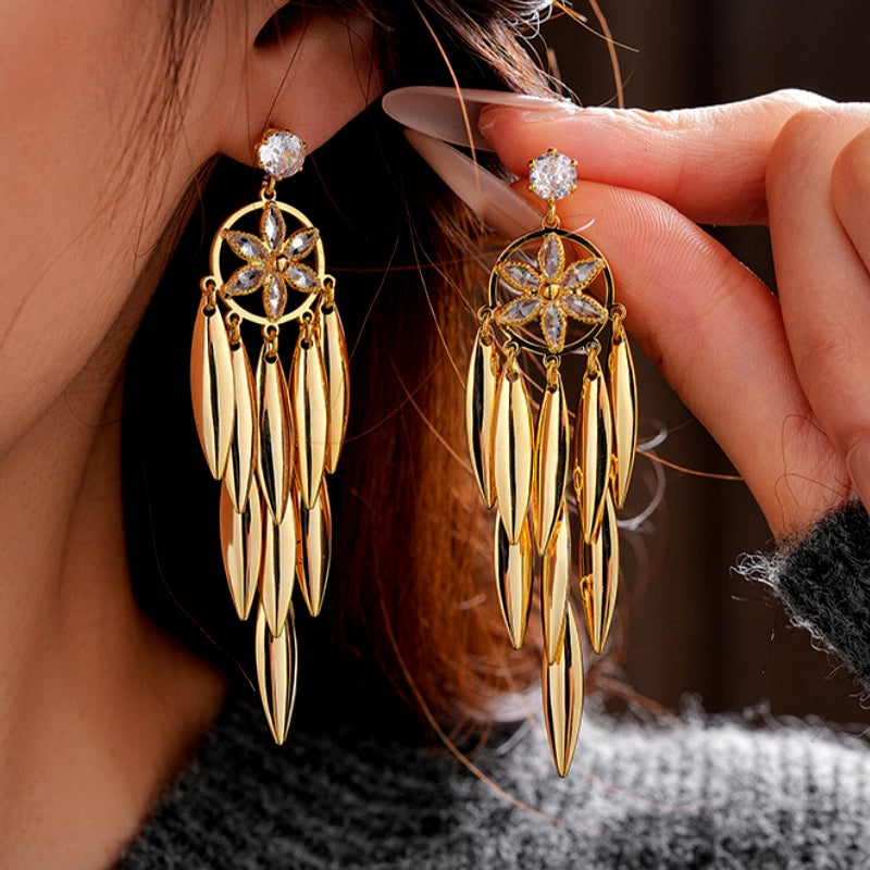 14K Gold-Plated Zircon Leaf Tassel Earrings