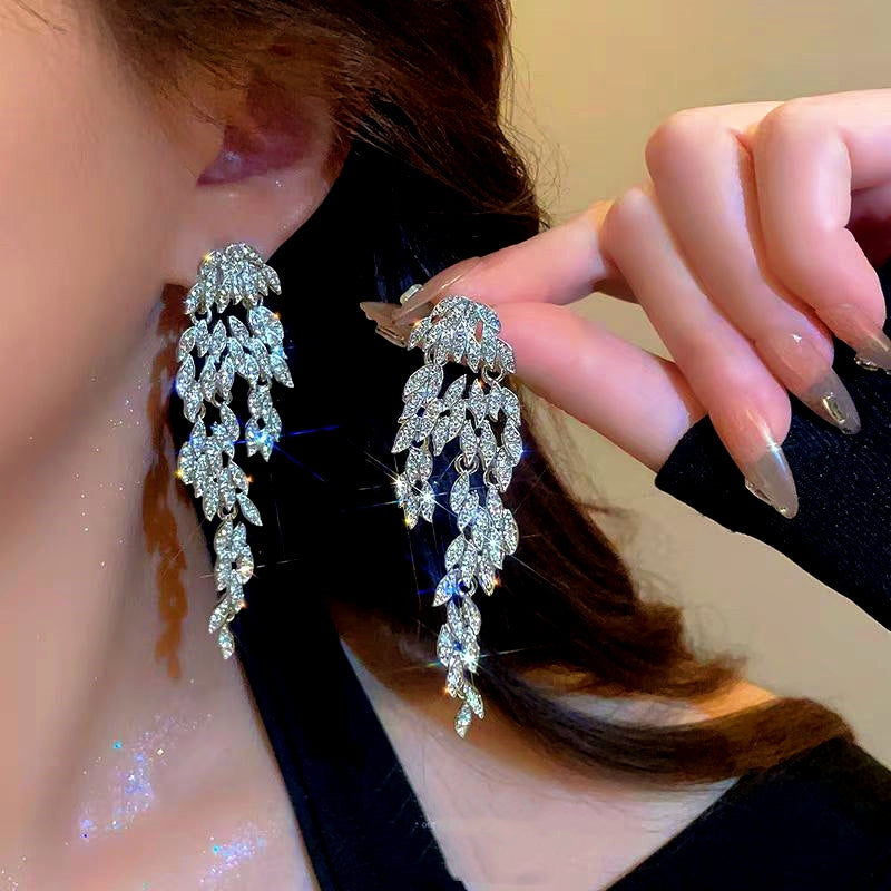 14K Gold-Plated Zircon Leaf Tassel Earrings
