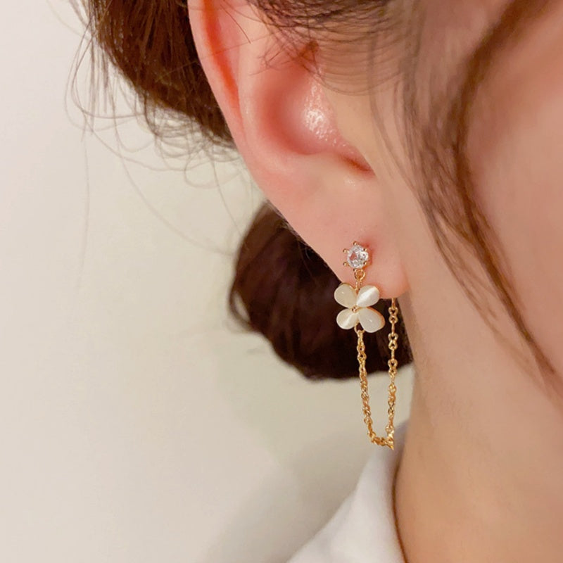 14K Gold-Plated Zircon Opal Four-Leaf Flower Chain Earrings