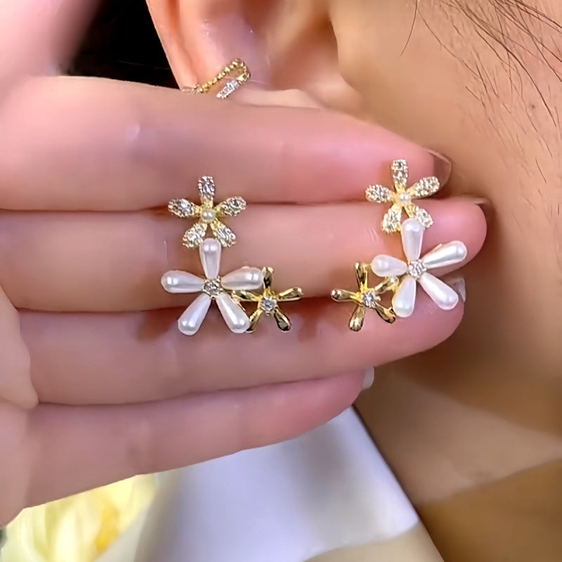 14K Gold-Plated Zircon Pearl Flower Earrings